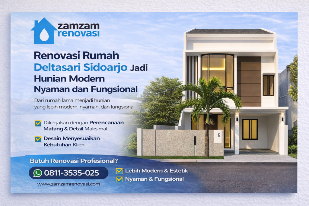 Renovasi rumah kini menjadi solusi terbaik bagi Anda yang ingin mengubah hunian lama menjadi lebih modern, nyaman, dan sesuai kebutuhan masa kini. Proyek renovasi rumah Deltasari Sidoarjo yang dikerjakan oleh tim Zamzam Renovasi menjadi salah satu contoh nyata bagaimana rumah lama bisa disulap menjadi hunian yang lebih estetik sekaligus fungsional.